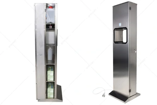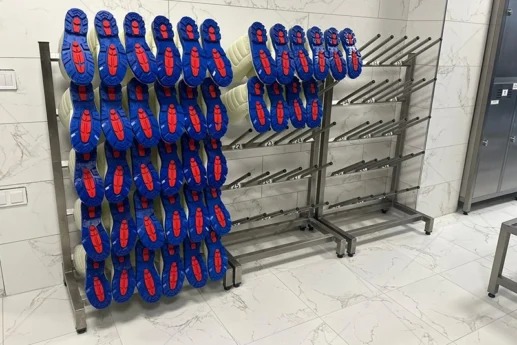 This category includes forced air boot dryer units, footwear and boot cleaning and brushing machines, manual boot washing units, tray washing machines, wet knife sterilization cabinets, parasite control tables, overhead meat transport trolleys, crate transport trolleys, disinfectant stands, wall-mounted disinfectant dispensers, overshoe and hairnet and mask storage cabinets, visitor coat lockers, and ramped hygienic foot mats.