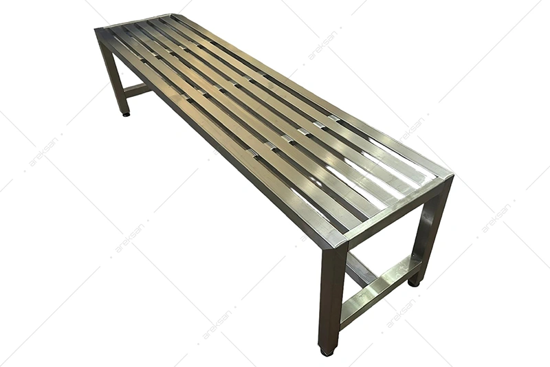Fabricated from 304-grade stainless steel square profile. The slatted seat surface prevents moisture and water from pooling on the surface, supporting hygienic use in wet and high-humidity environments. The lower frame provides mechanical rigidity. All surfaces are compatible with standard industrial cleaning protocols.