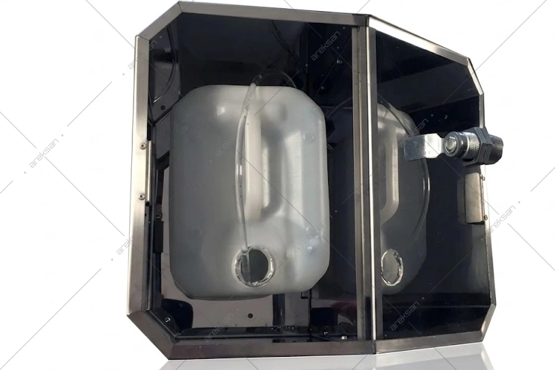 A 5-litre disinfectant container is placed directly into the housing bay; the system draws disinfectant directly from the container. Mains input is 220V, converted to 24V output. The system is controlled by a 12V electronic board. The 24V operating voltage prioritizes user safety.